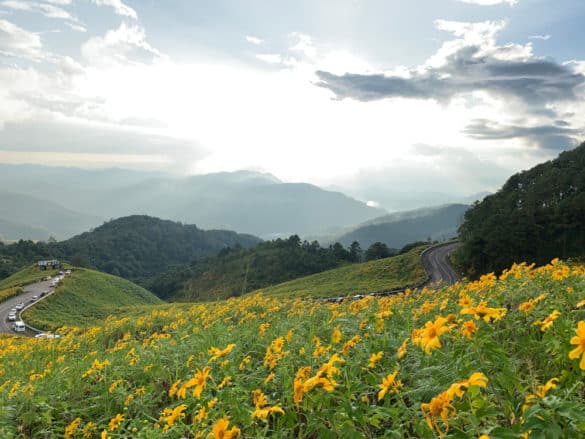 From Khun Yuam on Route 108 turn up further into the mountains on route 1263 it’s a good road that twists and climbs for about 25kms. Finally, at an altitude of 1,600 meters one starts to see the yellow hillside and shortly one is surrounded by the masses of bright yellow ‘Sunflowers’.